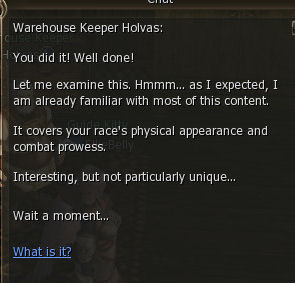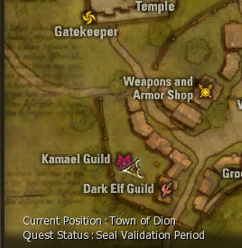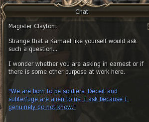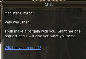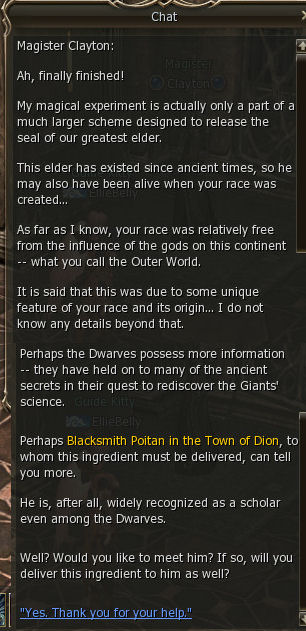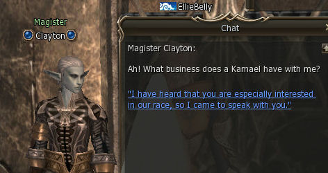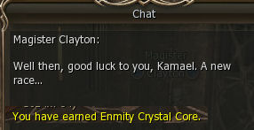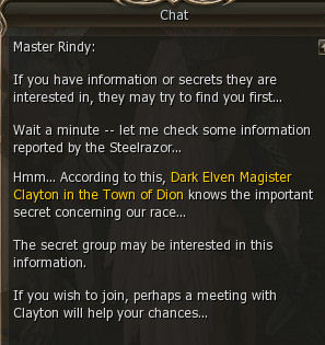 1) This quest starts in the town of Dion in the Kamael guild which is behind the Dark Elf Guild, out in the open. Speak to Master Rindy. She gives you 64 dimensional diamonds and say to talk to Clayton, also in Dion.