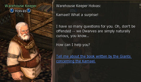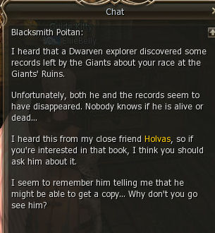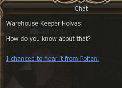 5) In the Blacksmith Shop Poitan talks for ages then sends you to the Warehouse, again in Dion to find Warehouse Keeper Holvas.