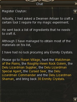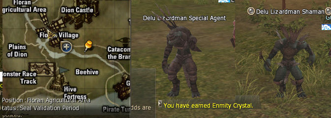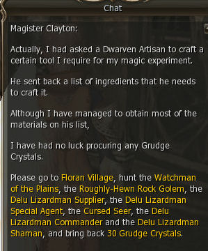 2) Clayton is in the Dark Elf Guild two steps away and gives you a big list of mobs to hunt to retrieve "Grudge Crystals" which are actually Enmity Crystals. The mobs can be found all over near Floran.