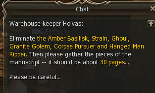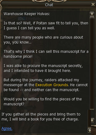 7) Head to the Execution Grounds and hunt the mobs until you have 30 Manuscript Pages. Then go back to Holvas.