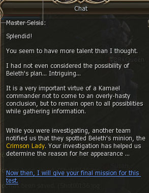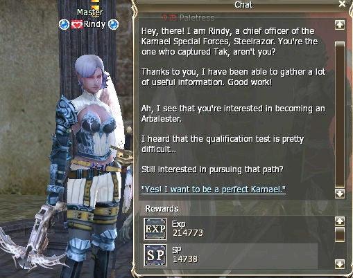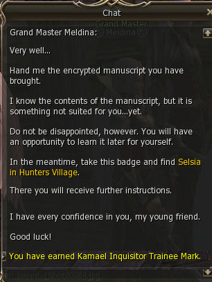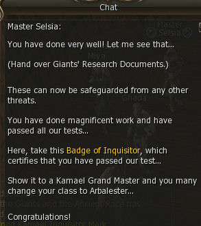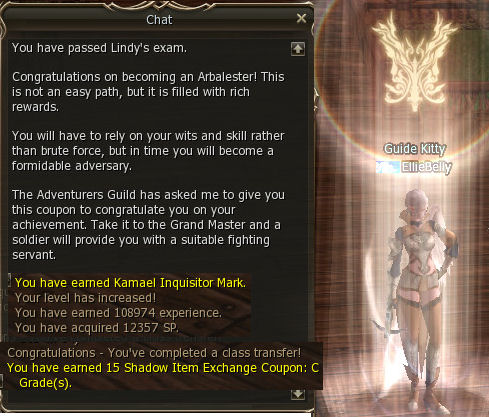 19) Talk to Selsia and you're done! You earn Kamael Inquistor Mark, 108,974 exp, 12,357 sp, and 15 Shadow Item Exchange Coupon C grade. The Grand Master that can change your class to Arbalester is standing right next to Selsia. Congrats!