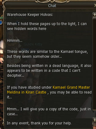 8) Holvas sends you to Kamael Grand Master Meldina in Giran Castle Town.