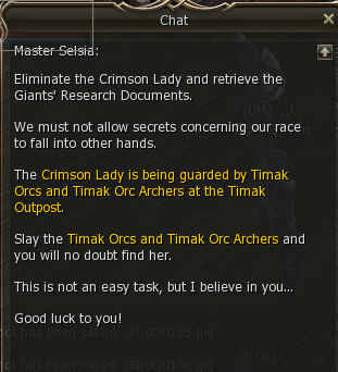 17) Selsia sends you to hung Timak Orc Archers and "Timak Orcs" but the quest steps say the archers and SOLDIERS.