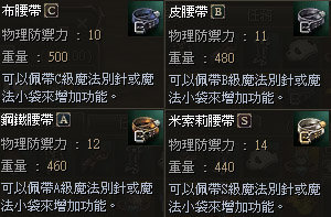 Belts can be upgraded with a Magic Pin (for a higher weight limit of the character), a Magic Pouch (for an increased number of inventory slots), a Magic Ornament (for increased Attack or Defense power in PvP), or a Magic Rune Clip (for increased HP or MP recovery), but with only one of those accessories. This is a relatively complicated process, with random factors involved. Here is the price list for the Belt System items available from the Territory Manager: