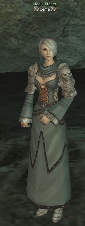 Cema is a magic trader in Hardin's Academy and sells D grade mage weapons both normal and common, as well as consumables, such as Cursed Bones.