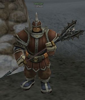 Cromwell is a guard in Dwarven Village and defends the northern entrance of town with Runant.