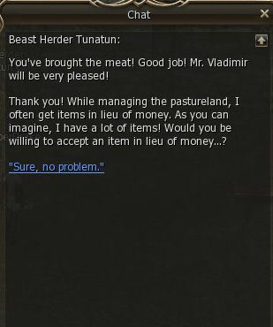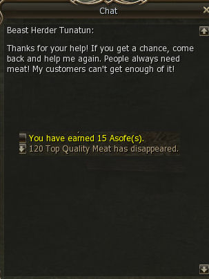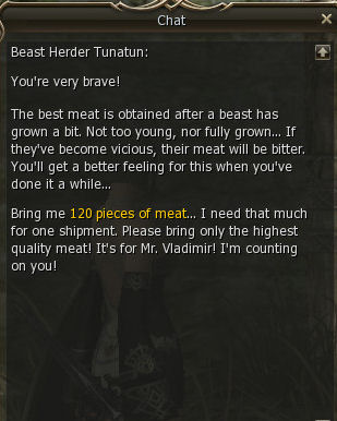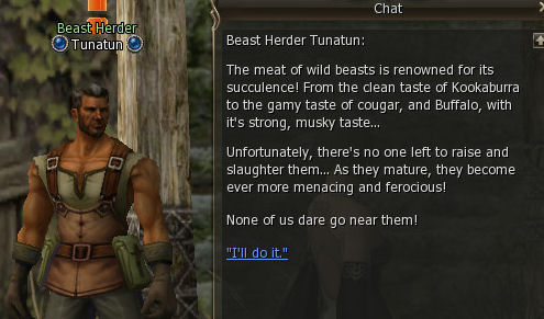 1) This quest starts at the Beast Farm with Beast Herder Tunatun. He asks that you hunt Alpen Kookaburra, Alpen Cougar and Alpen Buffalo and bring back their meat.