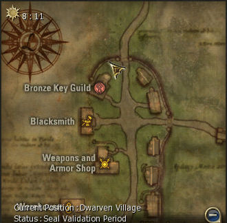 Dorf can be found standing near the north entrance to Dwarven Village. Unlike the rest of the Dwarves in town, he sees the overwhelming desire for money and material goods as being mentally unbalanced.