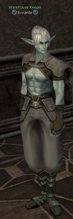 Warehouse Keeper Erviante is located in the Warehouse in Dark Elven Village. He gives his word that your items are safe with him.