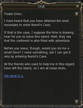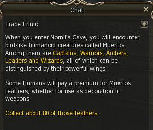 2) Erinu asks you to go to Nornil's Cave in the eastern part of the island and kill Shady Muertos. As with many Kamael quests, the names of the monsters he gives you are somewhat different from the mobs you will encounter in the cave. Especially misleading is the term "Guard Captain" on the quest screen. There are highly aggressive lvl 16 Shady Muertos Guards, crossbow shooters with a fantastic aggro range and respawn rate, that do NOT give the quest items. And - further into the cave - there are lvl 17 Shady Muertos Captains that DO give the quest items.