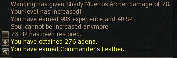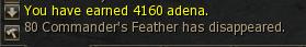 5) Return to Trader Erinu. He offers you 4160a for 80 Feathers, i.e. 52a per Feather. Considering that you will have used up around 1500 Soulshots, 25 Lesser Healing Potions and 10 regular Healing Potions, that is definitely not enough. But there is no room for bargaining, so accept his offer.
