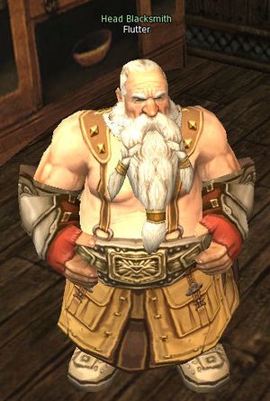 Head Blacksmith Flutter is in the Blacksmith Shop in the Town of Oren. He is a member of the Black Anvil Guild and can assist [[Artisan]s with changing over to Warsmith.