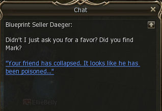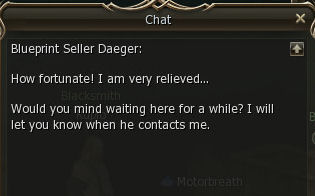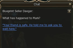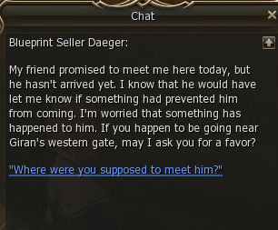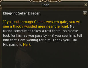 1) The quest start in Giran Castle Town in the Blacksmith shop with Blueprint Seller Daeger. He asks you to find his friend Mark. I guess NCsoft ran out of good NPC names.