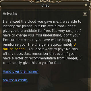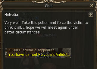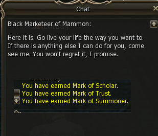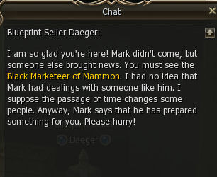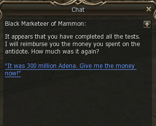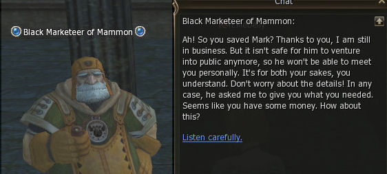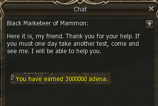 Then talk to him again right away. He sends you to the Black Marketeer of Mammon. Apparently Mark got better super fast and did something nice for you and your 3 mill adena.