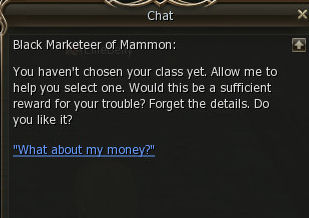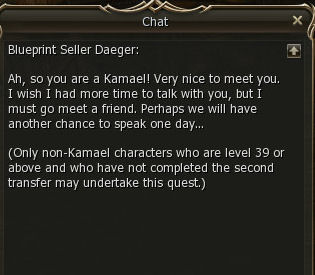 7) The Black Marketeer is just outside the Kamael Guild in town and depending on which race (I was human here) and what 1st class you chose, gives you the choice of what class you want to be, and gives you all three items you need to switch over, assuming you are level 40 already. You will just need to go the head person of your class and switch over.