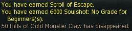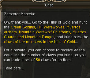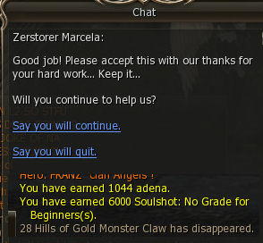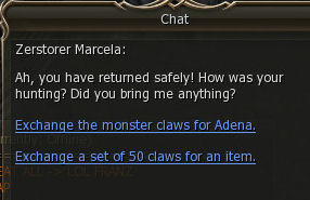3) Back at Marcela, if you exchange the claws for adena, you'll get adena (a basic reward of 400a plus 23a per Monster Claw) and a one time gift of 6,000 Soulshots No-Grade for Beginners or, if you are a mage class, 3,000 Spiritshots No-Grade for Beginners. You'll get the Shots even when you turn in only 1 item.
