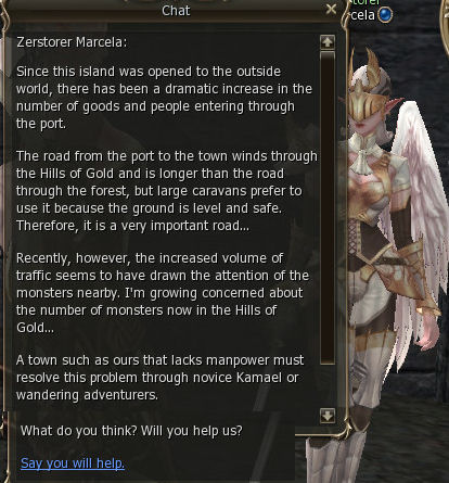 1) This quest, which can be picked up by characters of all races and classes at lvl 6, starts with Zerstorer Marcela at the southwest exit of the Kamael Village. Pick "Head for the Hills", as she also has another quest. She asks you to hunt various mobs and bring back items.