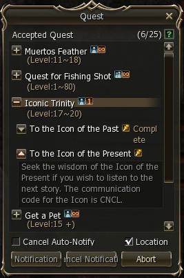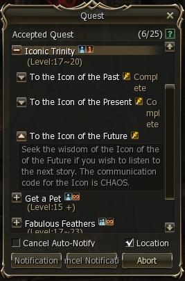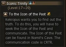 1) This one-time quest, which can be picked up at level 17, starts with Hierarch Kekropus on the balcony in the House of Elders at the Kamael Village. Since you have to fight your way through highly aggressive double HP mobs to reach the rooms with the iconic statues, I would recommend to solo players to bring a top no-grade weapon, regular Healing Potions (which can only be purchased on the mainland) and not to start the quest before they have reached level 18. But if you intend to do "Into the Large Cavern" later on, you should also not be higher than 19. The latter quest can not be done by characters over 20 and in the course of Iconic Trinity you might gain up to one full level, especially if you do it together with Fabulous Feathers.