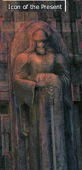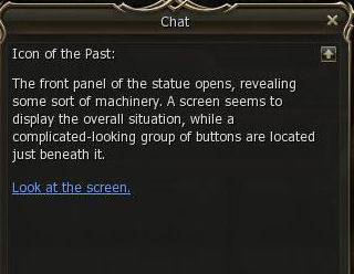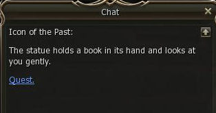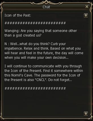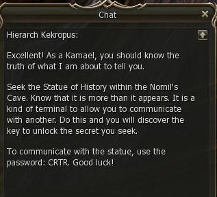 4) When you agree, Kekropus sends you to Nornil's Cave where you have to find the "Statue of History" (also called "Icon of the Past"). The statue is in fact a terminal that enables you to communicate with an other entity. Kekropus tells you that the password for the terminal is CRTR, but if you forget to note it down you will also find it on the quest screen.