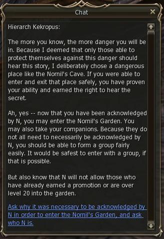20) Kekropus tells you about the existence of an "Erased History" of the Kamael, which is the same as the "Lost History" N. talked about. By returning alive from a dangerous place like Nornil's Cave you have proven your valour and earned the right to learn more about it. But that's another quest, "Into the large Cavern", which should only be attempted by groups. For now you get as a reward a Scroll Enchant Armor D.