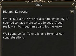 19) N. tells you the story how the island was unsealed and populated with young Kamael (originally there was only Hierarch Kekropus and a few other Elders). Then you are sent back to Kekropus in the village.