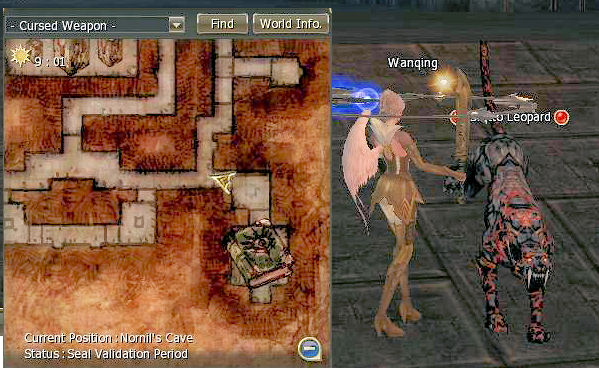 6) Now comes the difficult part. The corridor leading to the statue is full of highly aggressive Shady Muertos Guards and Grotto Leopards, both double HP, with strong P.Atk. and increasing in number as you descend. Be fast, don't hesitate, kill them as soon as you see them. Once you have reached the room with the statue, you are safe. There are no monsters in there. The statue is on the right side of the southern/back wall of the room. Some players have reported that they could not see the statue, just a blank wall. In that case you have to pull your line of sight upwards with your right mouse key. Then the statue with the name over its head will appear. Talk to it like to a regular NPC.
