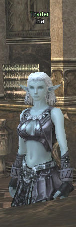 Iria is a trader in the Weapons and Armor Shop in Dark Elven Village. She is quite rude and can't tolerate people simply browsing her wares, and says they do not sell anything made by the dirty Humans.