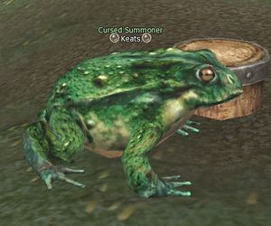 Cursed Summoner Keats sits at a table near the chefs at the Hot Springs. He has little to say other than some frog noises.
