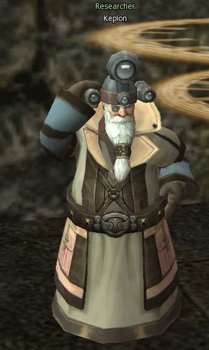 Researcher Keplon can be found at the top of the stairs in the Tower of Insolence on the first floor. He is a researcher from the Gray Pillar Guild sent to study the tower.