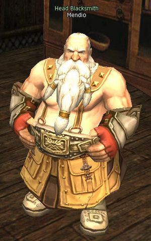 Mendio is the Head Blacksmith of the Black Anvil Guild in Gludio.
