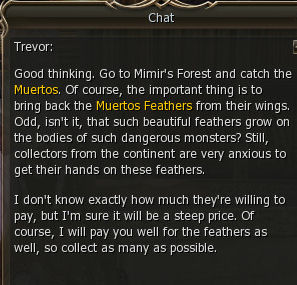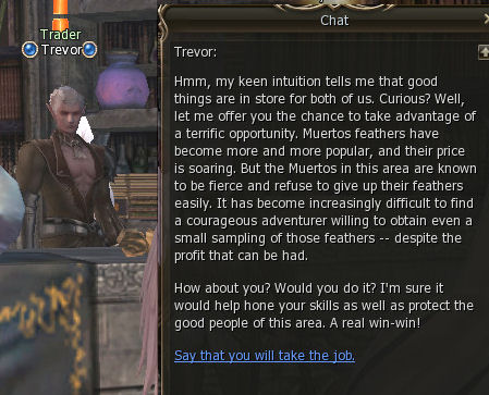1) This infinitely repeatable quest, which can be picked up at lvl 11, starts in the Kamael Village Grocery shop with Trader Trevor. He asks you to hunt Muertos and brings back their feathers.