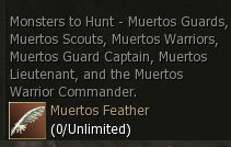 2) The lower level Muertos Guards (lvl 11, passive) and Muertos Scouts (lvl 12, passive) can be found in Mirmir's Forest, at the location marked with a pin on your map, and they all look pretty much the same. When you have some of the feathers return to Trevor.