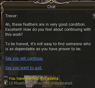 3) Trevor, who earlier said people would pay a steep price and he would personally pay well, is a bit of a liar. You get 45 adena per feather no matter how few or many you bring back.