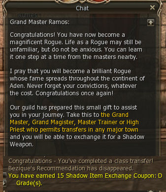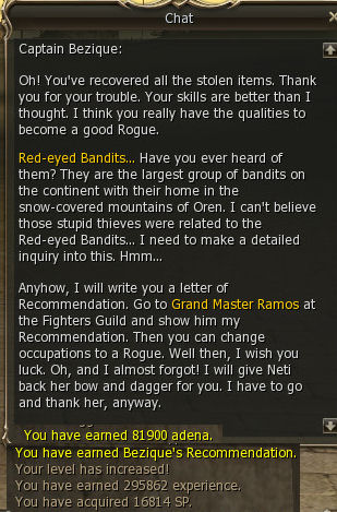 7) Then go back to Bezique for the last time. The CT2 rewards are 81,900 adena, 295,862 exp and 16,814 sp. Earlier versions had no adena and less exp/sp.