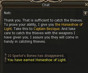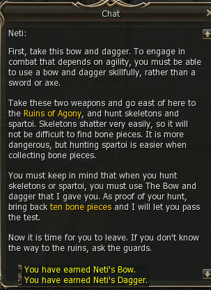 2) Neti gives you a non grade bow and dagger to take to the Ruins of Agony to kill the skeletons and spartoi with.