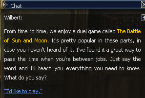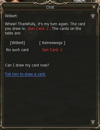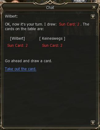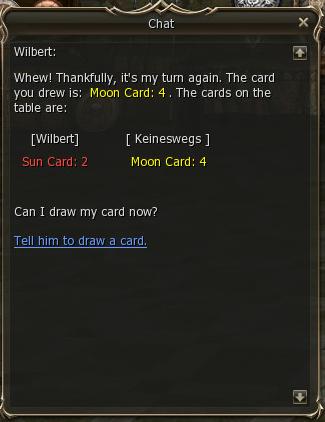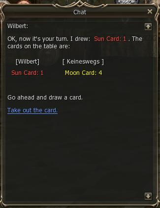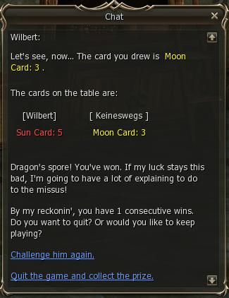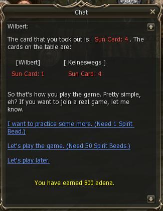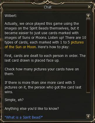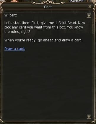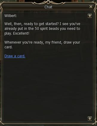 3) So to play all you need to do is hunt from the list of mobs until you get 50 Spirit Beads. The drop rate is pretty decent, one Spirit Bead for almost every other kill. Then you tell him you want to play and just keep clicking to pull a card until he tells you whether you won or lost. If you lost, you get nothing. If you win, you can take the reward or continue to play, and if you win again you can choose to take the next highest level prize. If you lose at any level, you get nothing. Blacksmith Wilbert even gives you an opportunity to practise with 1 Spirit Bead.