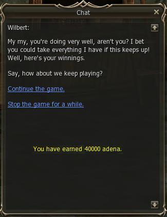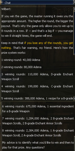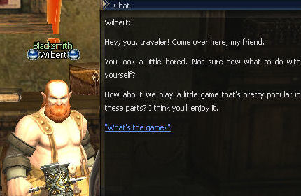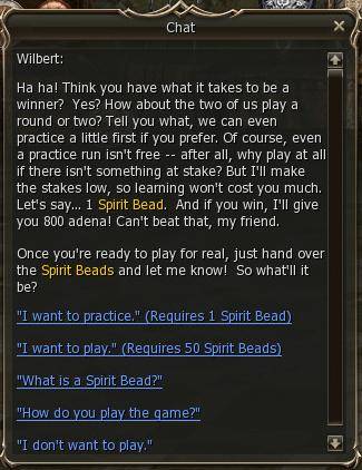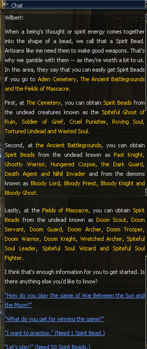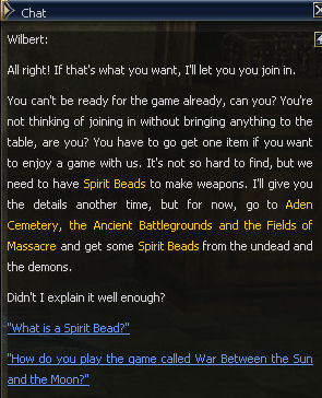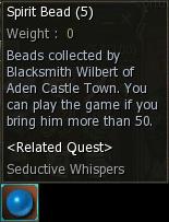 1) This infinitely repeatable quest, which can be picked up at lvl 50, starts in the in the Blacksmith Shop of Aden with Blacksmith Wilbert. The quest is pretty simple - hunt certain mobs to get Spirit Beads and come back to play a game.