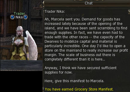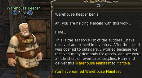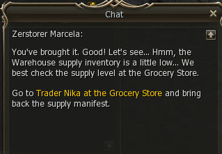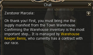 1) This one-time quest, which can be picked up at lvl 2, starts at the south west entrance to the Kamael Village and all steps are in the town itself. Speak to Zerstorer (German for "Destroyer") Marcela and choose Supply Check, as she has two available quests. She tells you to go to Warehouse Keeper Benis.