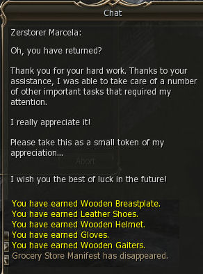 5) Marcela rewards you with a Wooden Breastplate, Leather Shoes, Wooden Helmet, Gloves and Wooden Gaiters. No other starter quest anywhere rewards this well.