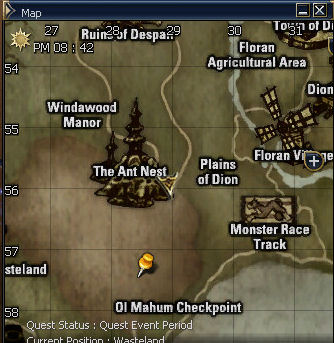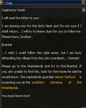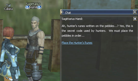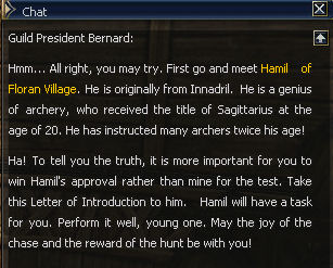 1) This quest starts at level 39, in Hunters Village with Guild President Bernard. You can target him right off the gatekeeper; he's up the stairs to the left of the gatekeeper in the first hut. He tells you to go meet the great archer Hamil in Floran Village.