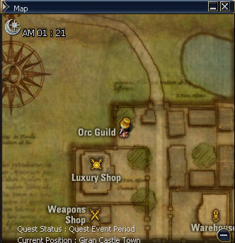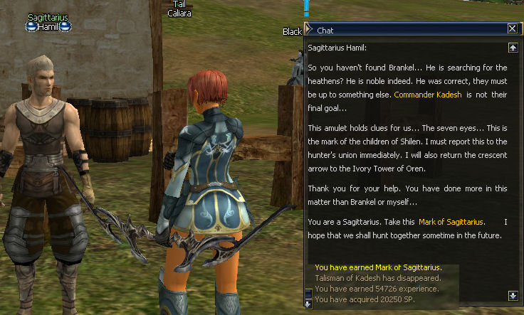 11) Speak with Hamil in Floran and receive your Mark of Sagitarius, 54,726 exp and 20,250 sp. When you hit 40 you can speak with the head of a Warrior Guild (such as the one in Oren) and inquire about the 2nd class change, and then switch to Hawkeye.