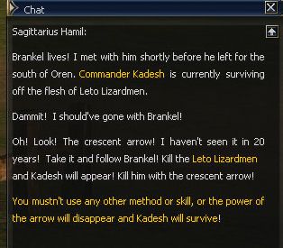 9) Back in Floran with Hamil once again, he gives you more mobs to kill. He tells you to kill Leto Lizardman, any of them it doesn't matter. He tells you to use the Cresent arrow on Commander Kadesh when he appears, but again it's not an arrow it's a BOW. He tells you not to use any other method or skill. It takes so long to summon him I didn't dare try anything else.