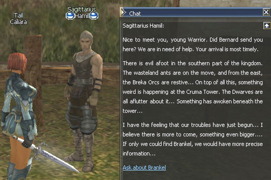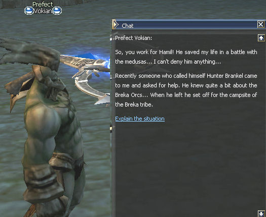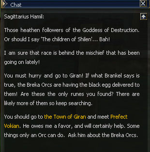 4) In Floran, Hamil tells you the Breka Orcs are evil and to go talk to Prefect Vokian in Giran.