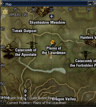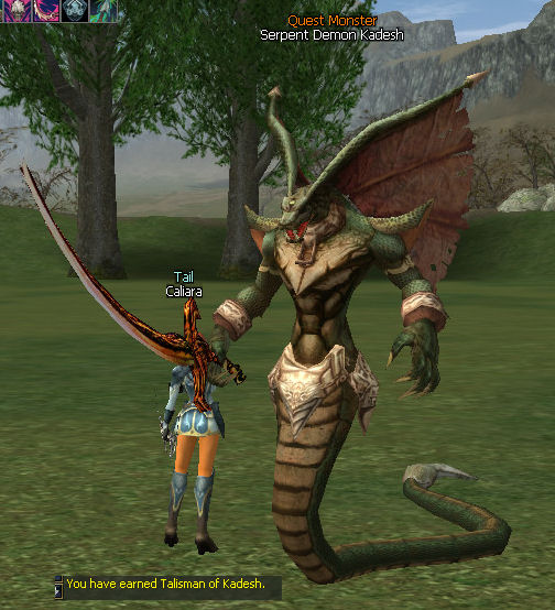 10) South of Oren in the Plains of the Lizardmen, you can kill any Leto Lizardmen to start collecting the quest items. I suggest hunting the Leto Lizardmen and Leto Archers because they are easiest, the ones in the fields with the Bloody Axe Elite. The old quest guide says Kadesh will show up after 100 quest items (one per mob) up to 130 items. I got him at 121 items. You have to kill at least 100 Leto Lizardmen so stock up on supplies and make sure you have enough wooden arrows (50 should be plenty). When Serpent Demon Kadesh appears, he will not be aggro. EQUIP THE CRESENT BOW and attack him. I used power shot during this and it didn't cause any problems. If you do it right you will get Talisman of Kadesh. Then go back to Sagittarius Hamil in Floran for the last time.