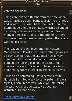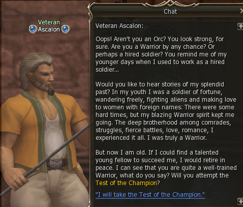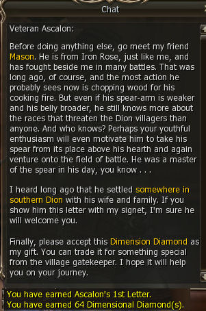 1) This quest starts at level 39 for Orcs, in the town of Giran with Veteran Ascalon who is next to the Weapons Shop. He sends you to Mason in Dion and gives you 64 dimensional diamonds.
