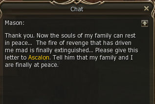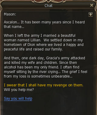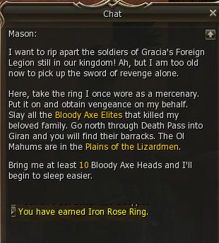 2) Mason is behind an empty building in Dion by the Warehouse. He wants you to kill Bloody Axe Elites and bring back 10 of their heads.