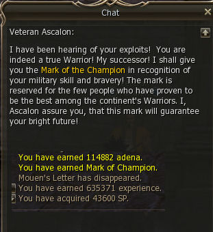 15) Ascalon rewards you with 114,882 adena, Mark of Champion, 635,371 exp and 43,600 sp. In versions prior to CT2 Gracia, there is no adena and much less exp/sp.