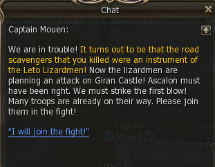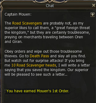 10) Captain Mouen is near the south exit of Oren and asks you to kill Road Scavengers and bring back 10 heads.