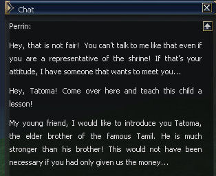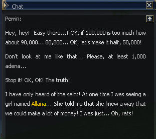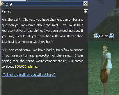 2) Perrin can be found up a hill near the harbor, and asked for the NPC's favorite amounts, which is 100k. The only option is to tell him no.