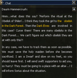 Daurin tells you to find the obelisk in the Dark Forest to stop a ritual.